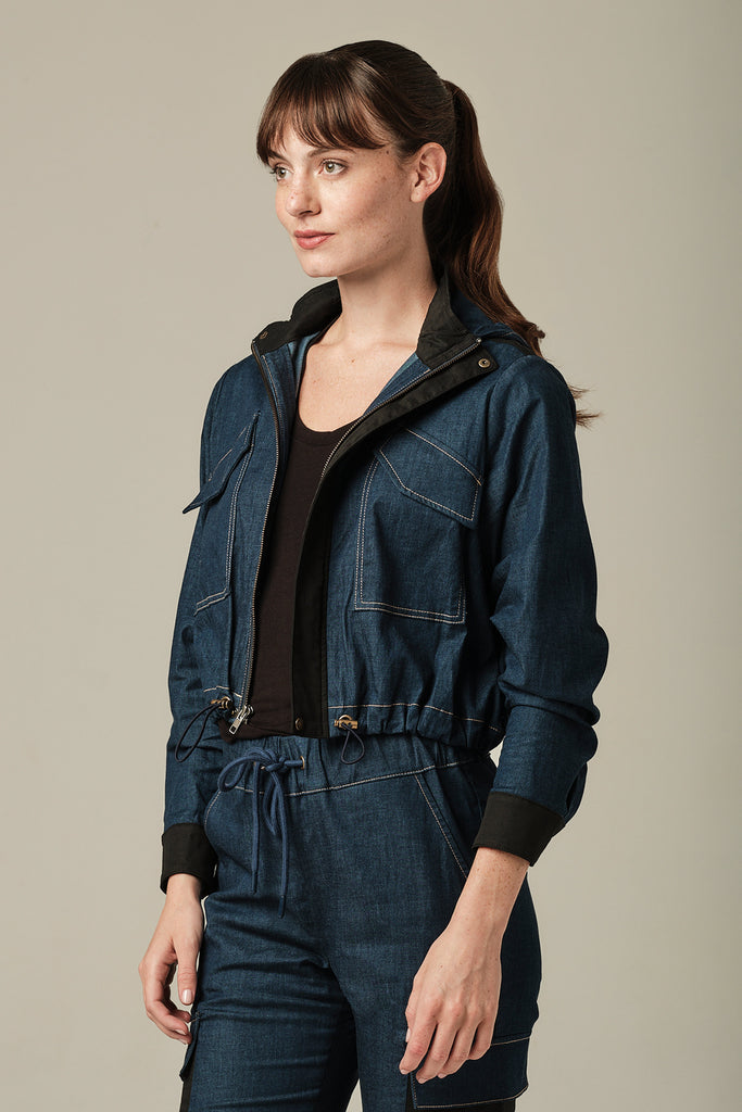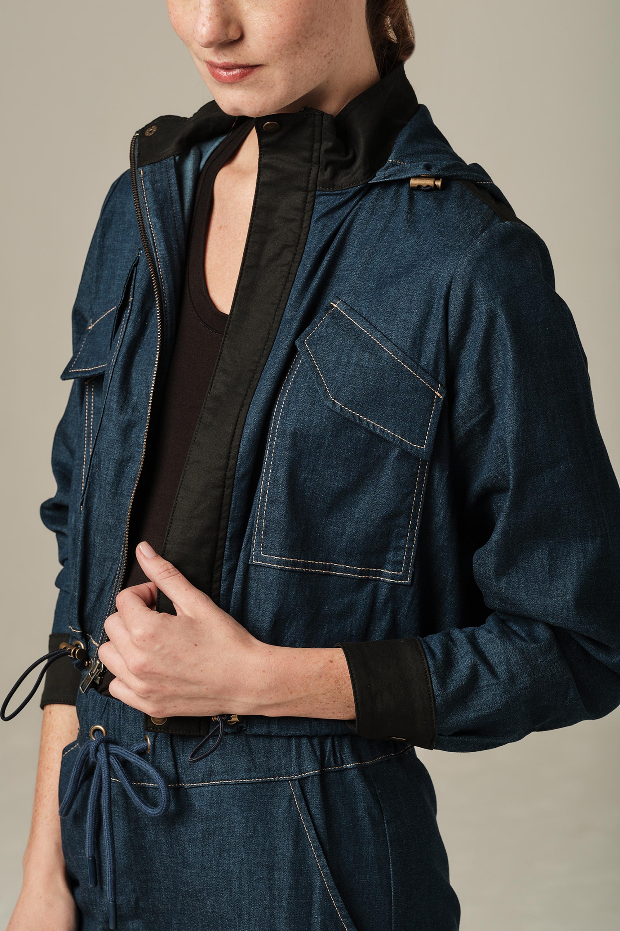Move with ease, rain or shine. This jean jacket is designed with a flattering, shape-retaining stretch that flexes effortlessly with your every move. Its sleek utility style features double front pockets, an adjustable drawstring waist, and contrast detailing for a modern, versatile look.