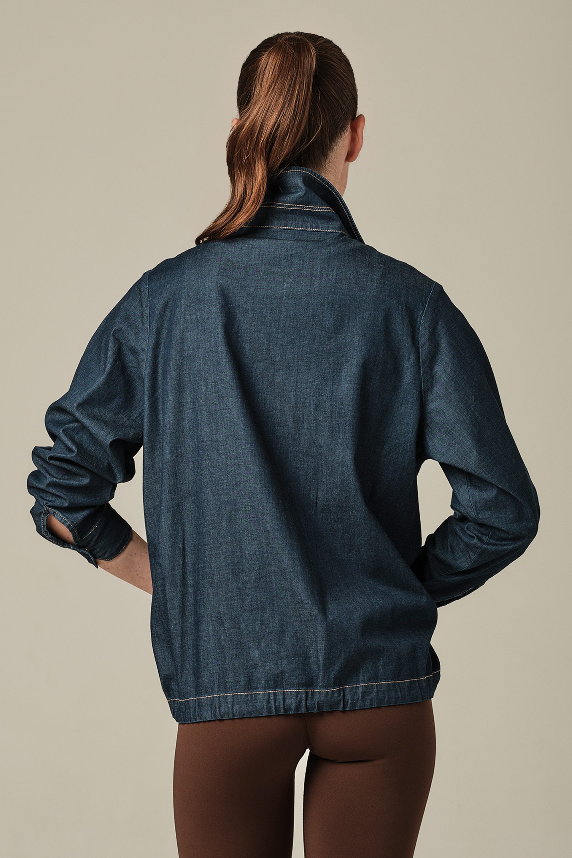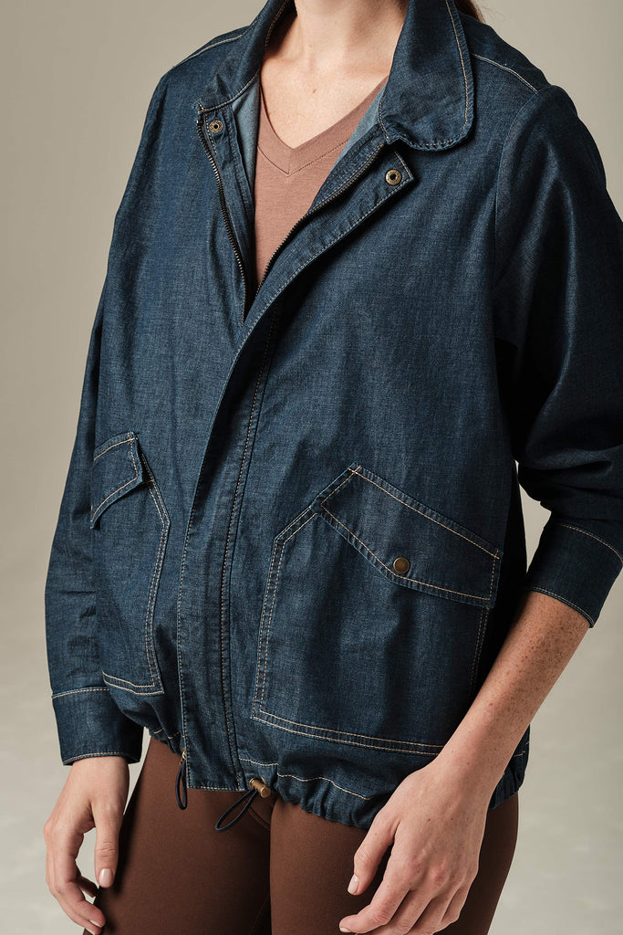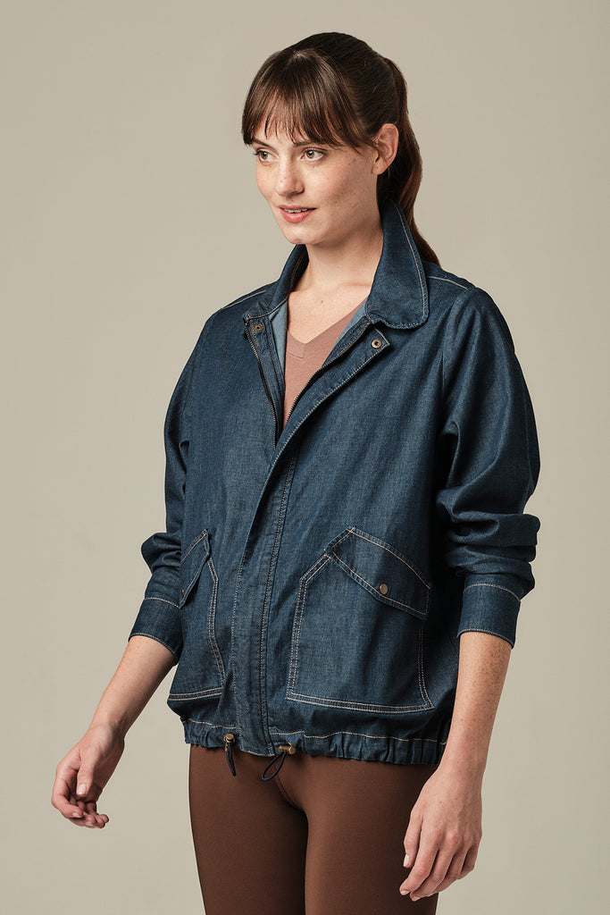 A modern twist on a wardrobe classic. This jean jacket is designed with a flattering, shape-retaining stretch that moves with you while keeping its structure. Featuring a pointed collar, angled front pockets, and a drawstring hem for an adjustable fit, it delivers effortless style with all-day comfort.